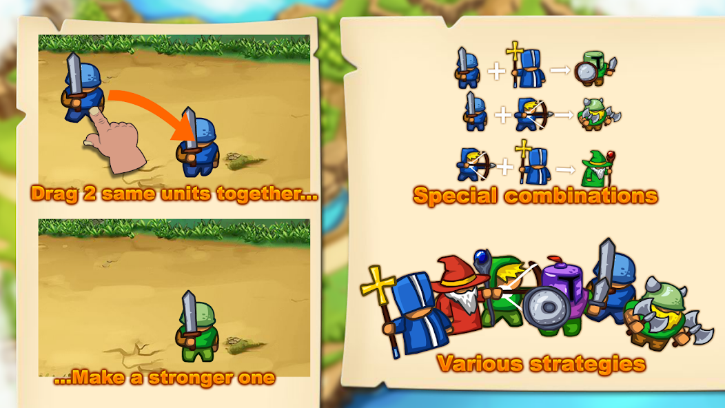 Оставьте своих могущественных воинов в битву и позвольте им сражаться. Перетащите воина в другого, чтобы создать более могущественных воинов.